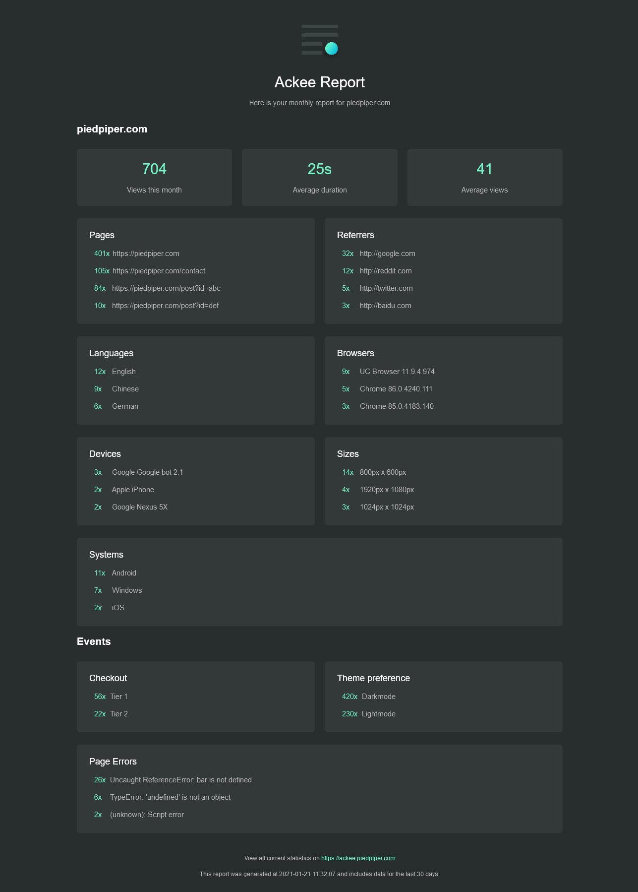 ackee-report lets you create monthly website performance reports using your Ackee analytics data and either send them via email, generate a RSS feed or output it to a JSON file. It uses Ackee's Graphql API and can be configured to generate multiple reports for different websites, data ranges and recipients.