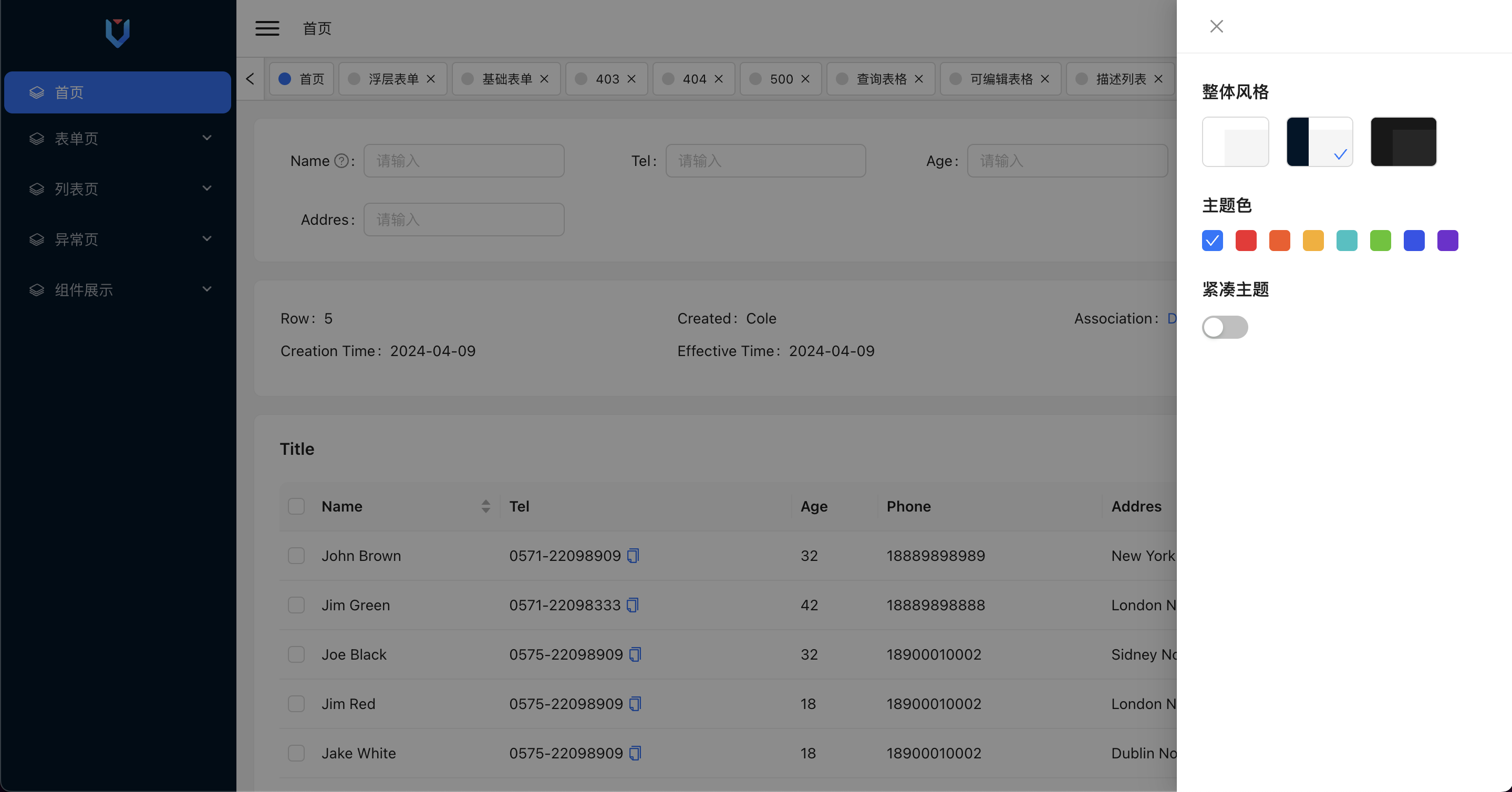 - 其他内置:主题切换、多语言、动态菜单栏、面包屑、全屏等