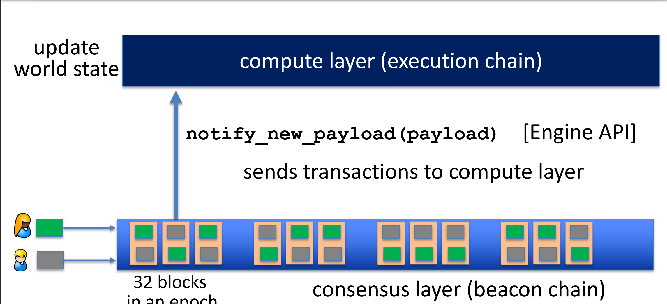- 执行层: Execution layer provides the execution engine, handles user transaction and all state (address, contract data)