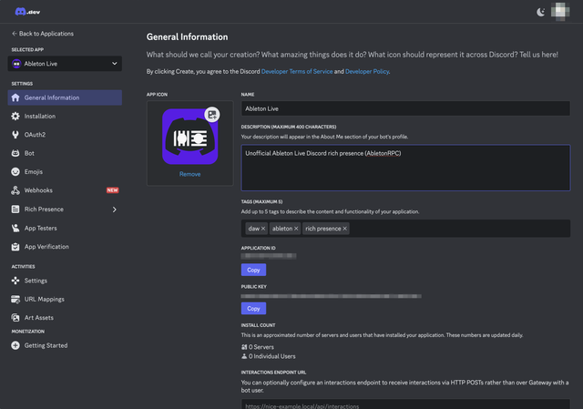 git clone https://github.com/KiwiSingh/AbletonRPC- Create a new application on your Discord Developer Portal, and fill in the deets as per the screenshots below.