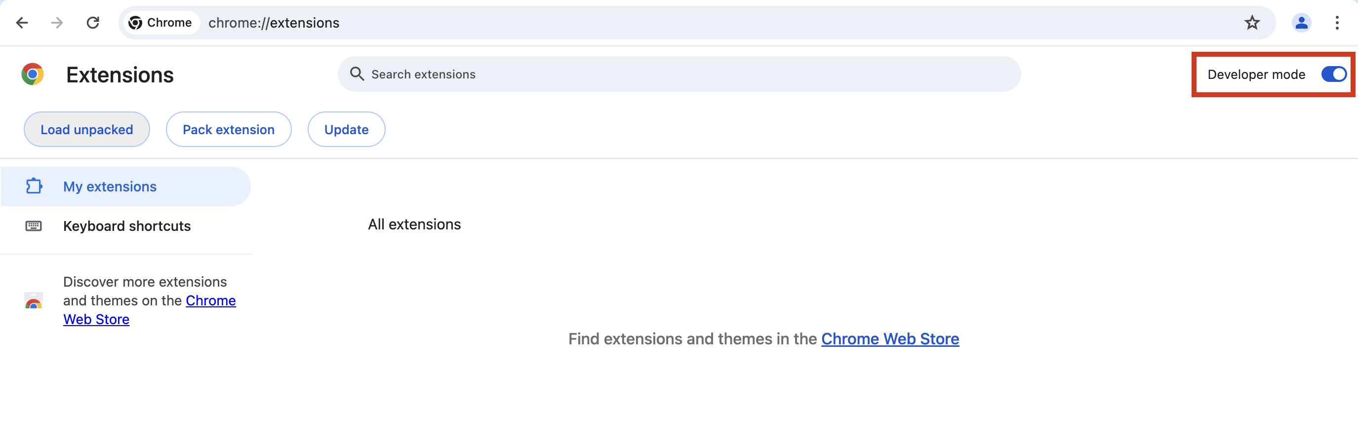 chrome://extensionsin the address bar and press Enter. - Enable the Developer mode toggle at the top right corner.