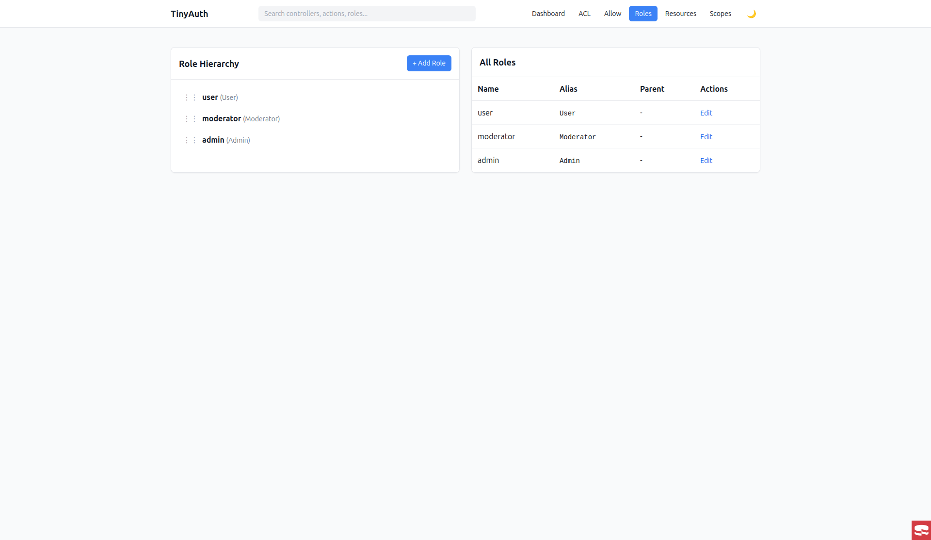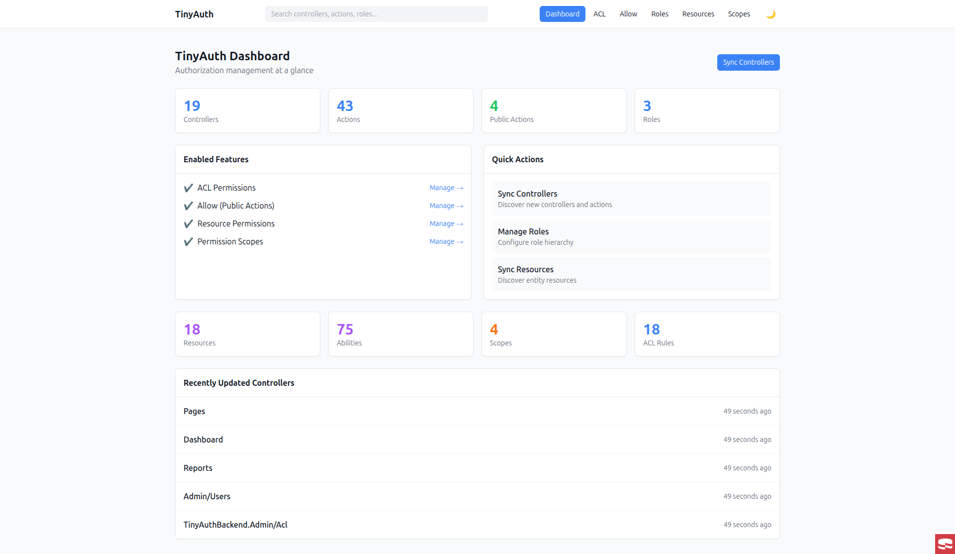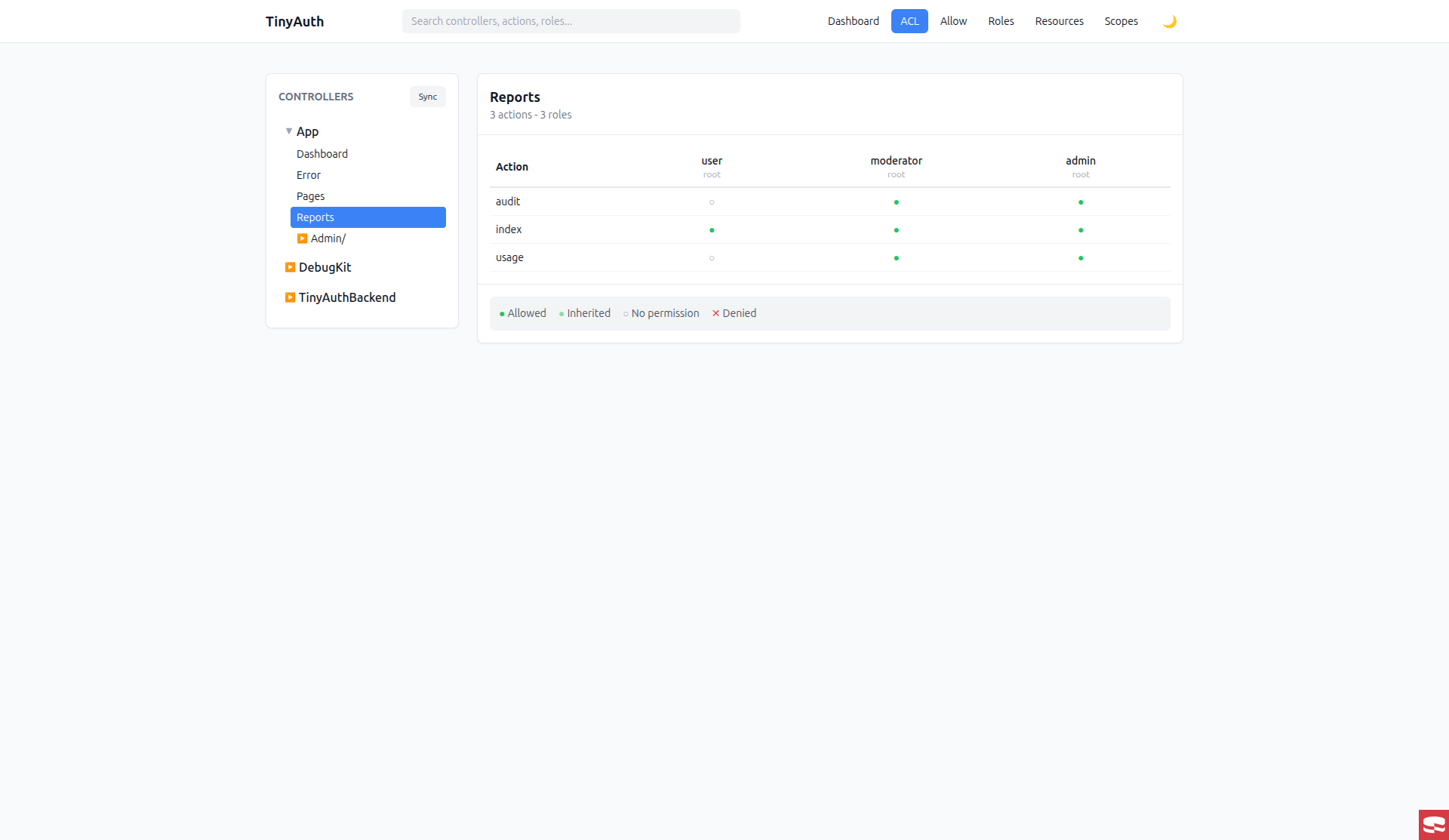 TinyAuthService- Central permission checkingHierarchyService- Role hierarchy traversalControllerSyncService- Controller/action discoveryResourceSyncService- Resource/ability discoveryImportExportService- JSON/CSV export and legacy INI importFeatureService- Enable/disable featuresRoleSourceService- Flexible role data sources