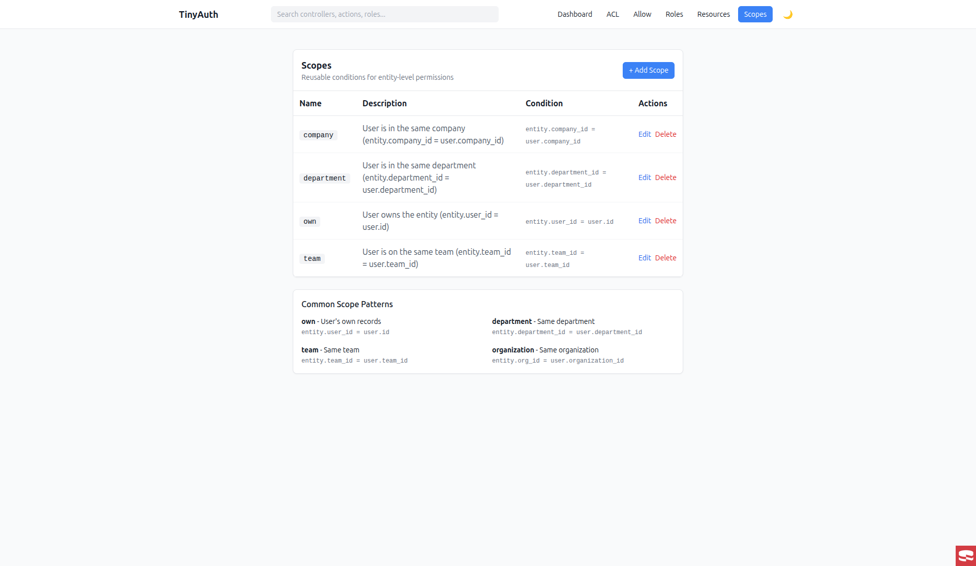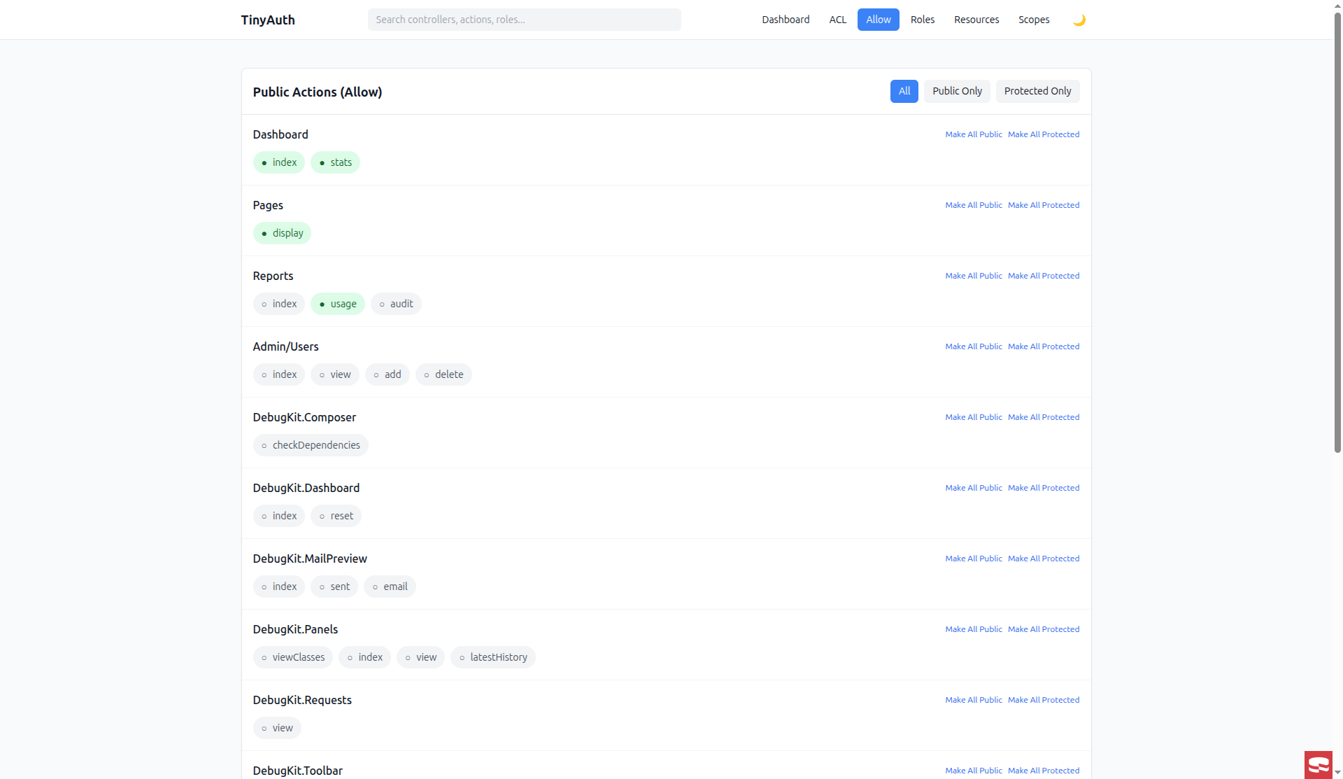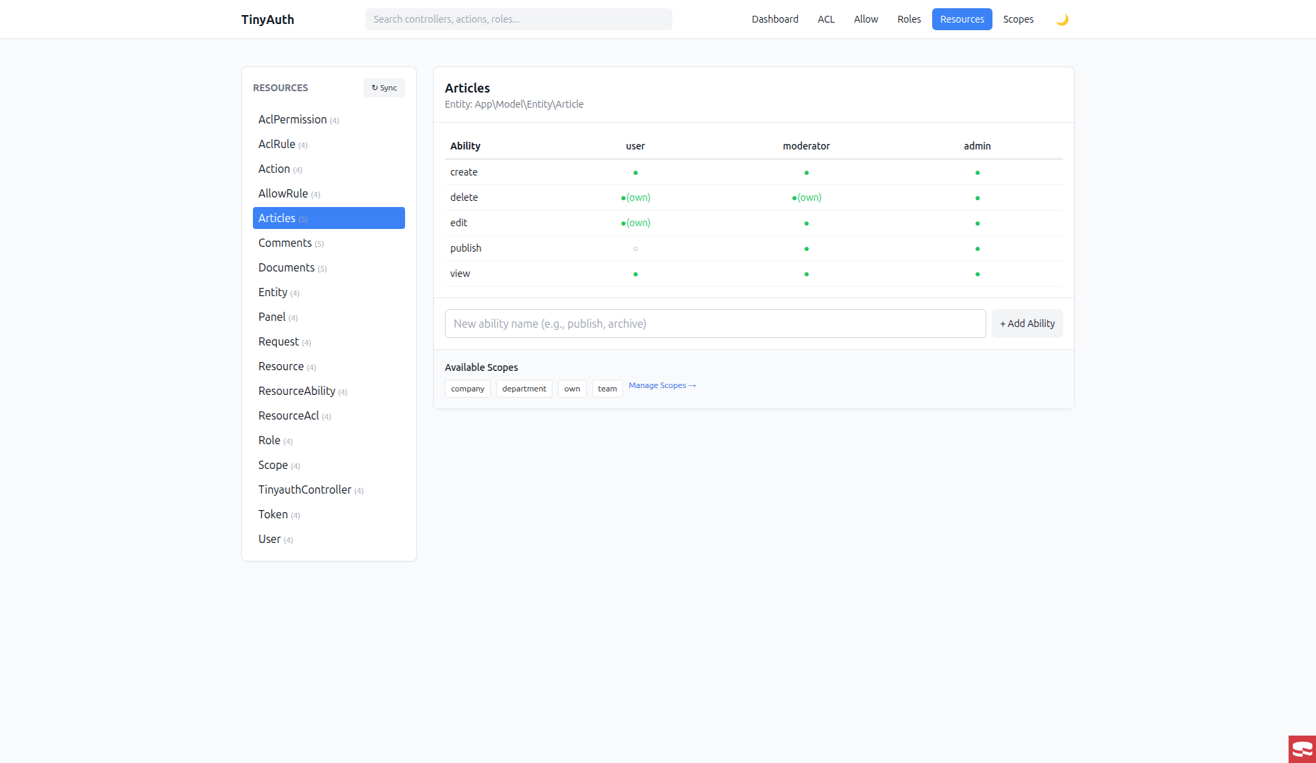 TinyAuthPolicyfor seamless cakephp/authorization integrationTinyAuthServicefor programmatic permission checks- Scope-aware queries for filtered results