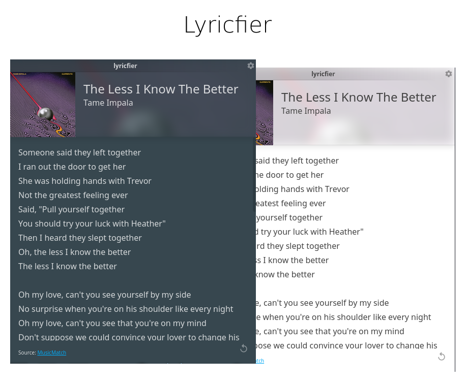 Lyricfier is an electron app that communicates with Spotify Desktop Client to get the current song and then looks for a matching lyric scraping the web.