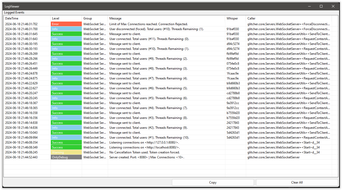 Servers.WebSocketServer wsServer = new Servers.WebSocketServer(port, maxConnections, APIKey, autostart);