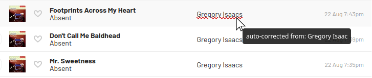 A userscript that highlights auto-corrected artist names and track titles on your last.fm profile pages. Last.fm will display corrected scrobble data when the 'Auto-correct the spelling of your scrobbles' option is enabled in the website settings. A last-fm pro-subscription is required for it to do its work.