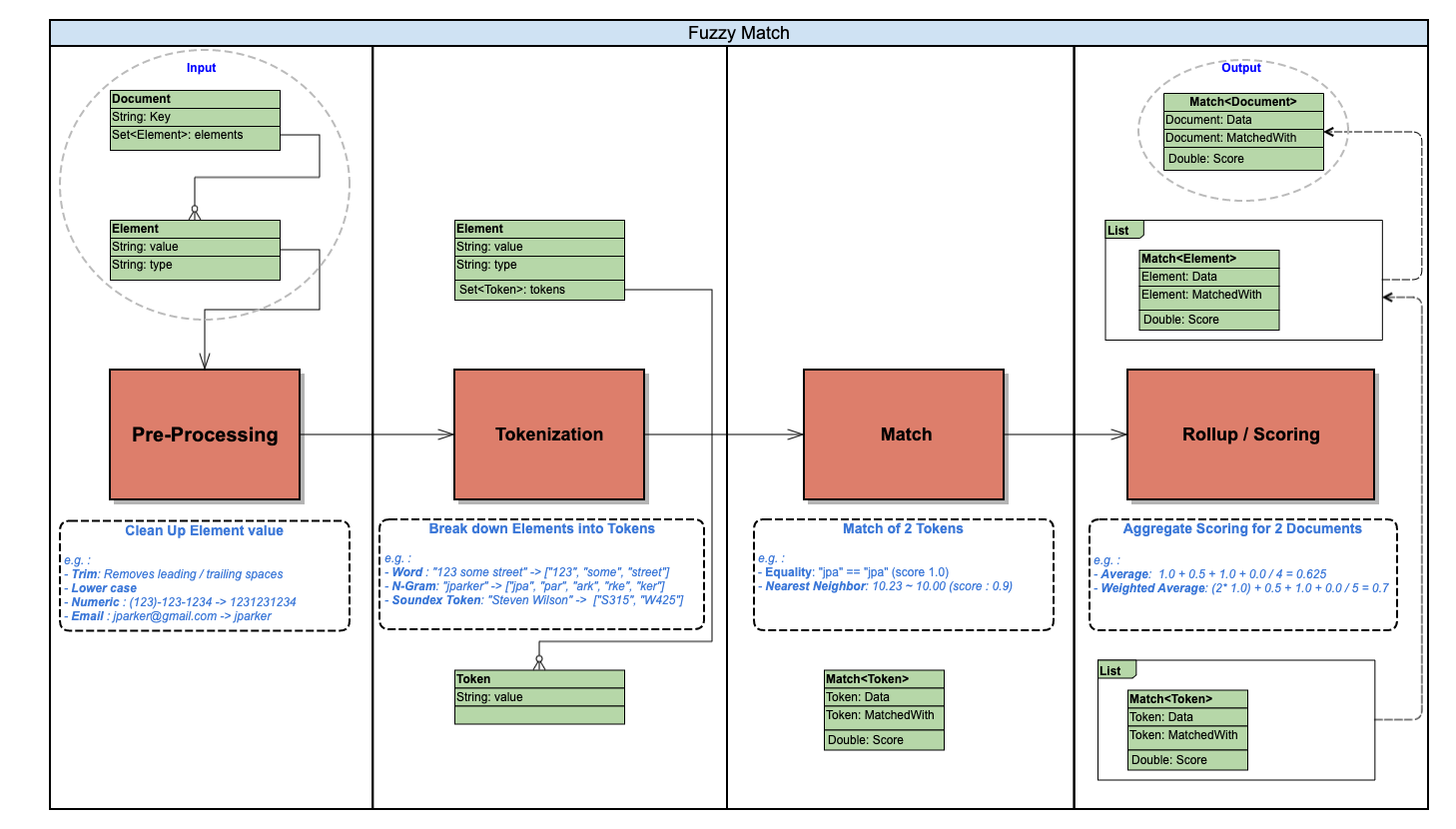 Imagine working in a system with a collection of contacts and wanting to match and categorize contacts with similar names, addresses or other attributes. The Fuzzy Match matching algorithm can help you do this. The Fuzzy Match algorithm can even help you find duplicate contacts, or prevent your system from adding duplicates.