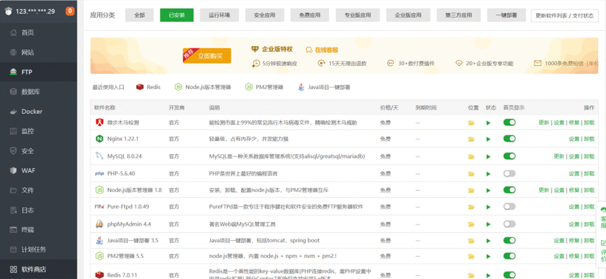 其余mysql、redis、nginx 在下载宝塔安装时进入宝塔面板中在软件商店里即可下载