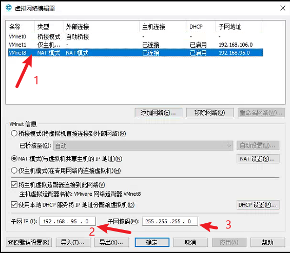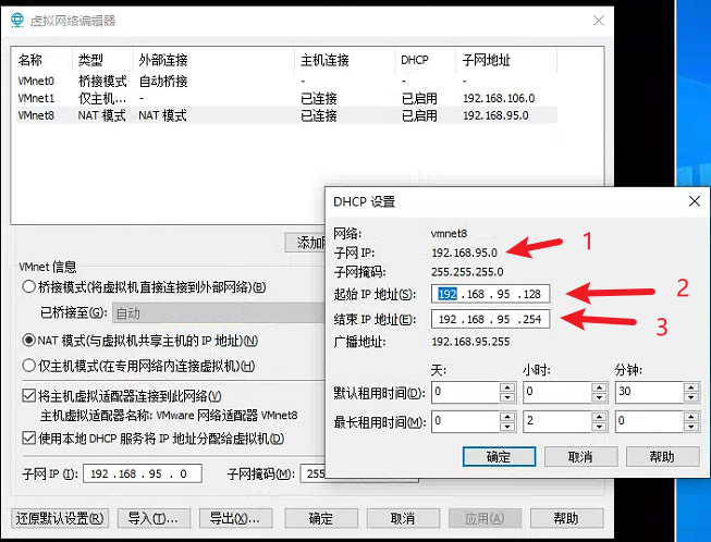 确定编辑完之后,再回来编辑DHCP设置(一般不用编辑,这个时候主要是打开查看一下,刚才在外面设置的那个子网ip对不对)确认子网ip为刚才我们设置的子网ip 并且查看起始和结束地址为128~254(待会虚拟机配置文件的ip必须得在这个范围之内)