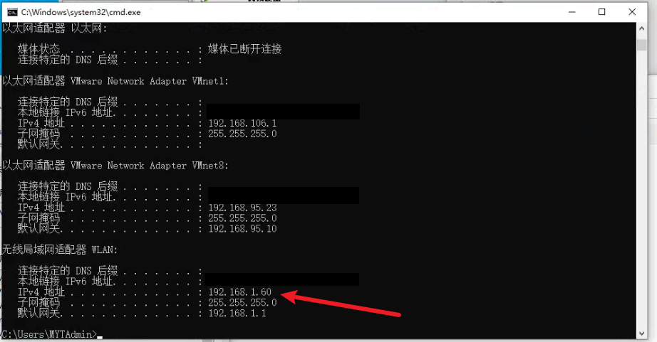 win+r,然后输入cmd回车,输入ipconfig 查看自己电脑的ip地址,就是我图片指向的这个 (根据每台电脑不同,有可能用的无线,有可能有限,看你自己使用的网卡是哪一个)