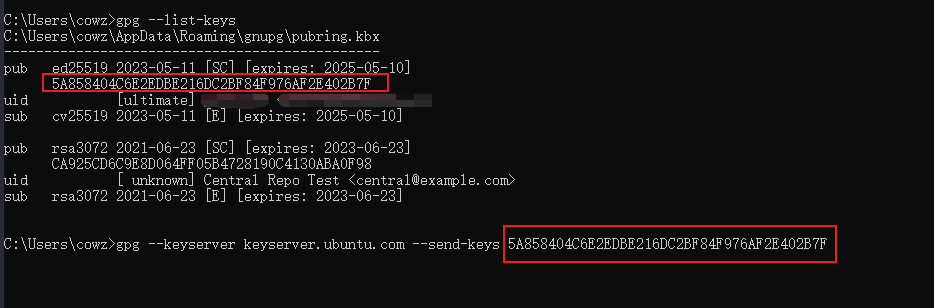 - 下载 GPG 工具,在命令行执行 gpg --gen-key** **命令,按照指示(会要求输入私钥,需保存)生成密钥对。gpg --list-keys 命令可以查看已生成的密钥对。通过 gpg --keyserver keyserver.ubuntu.com --send-keys 公钥 命令将密钥对发到服务器,供后面验证使用