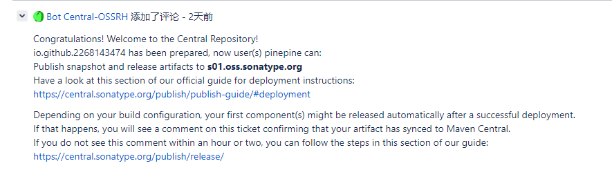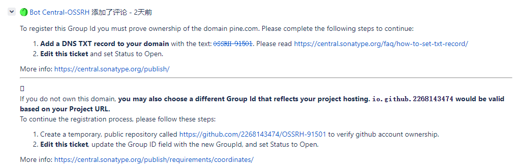 根据评论的提示,如果我们的 Group Id 是域名,则需要给域名添加一条解析记录;如果是 GitHub 的话,则需要创建一个新的仓库来完成验证;做完之后将问题调整为开放状态等待审核(因为我这里是已经完成了,所以是已解决状态)