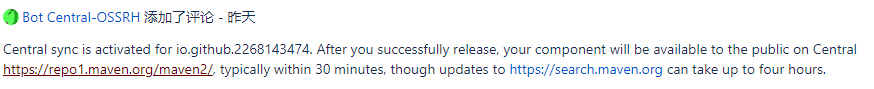 - 到这里就完成了,接下来等着其他各大仓库自动同步(网上说4h,但我实际测试用了接近7h)就可以了。Maven 中央仓库首先可以查到(这个很快,半小时内就可以查到了),然后是我们熟知的https://mvnrepository.com/和其他仓库