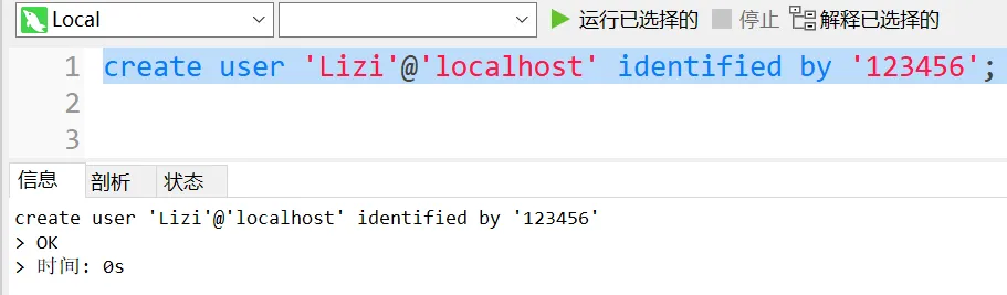语法:create user '用户名'@'IP' identified by '密码';
