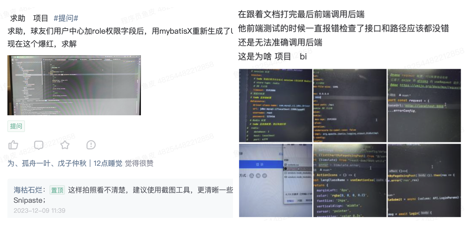 鱼皮做编程分享答疑多年来,无数次看到有的同学遇到 Bug 时,直接通过拍照、或者发没有格式的代码文本的方式来求助他人。