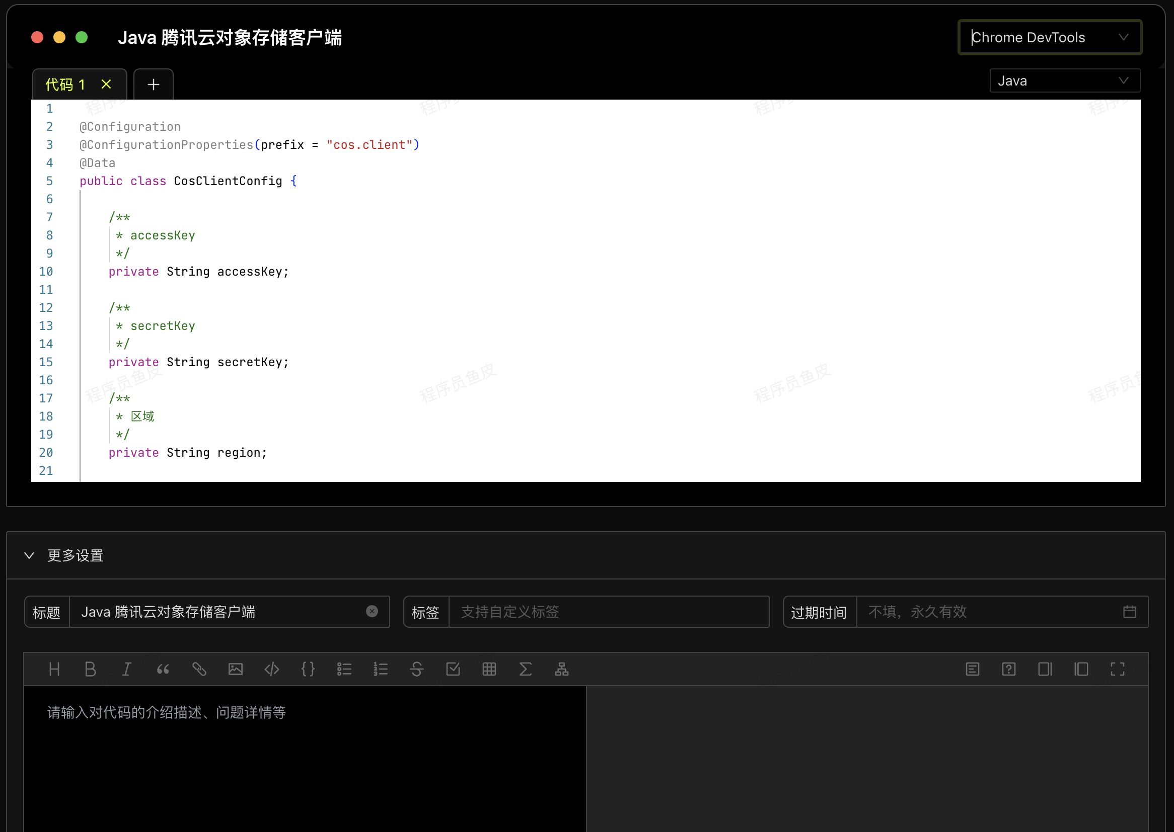 你还可以自由切换主题、给小抄设置过期时间、或者用 Markdown 来补充代码的描述(报错信息也可以贴到描述中):