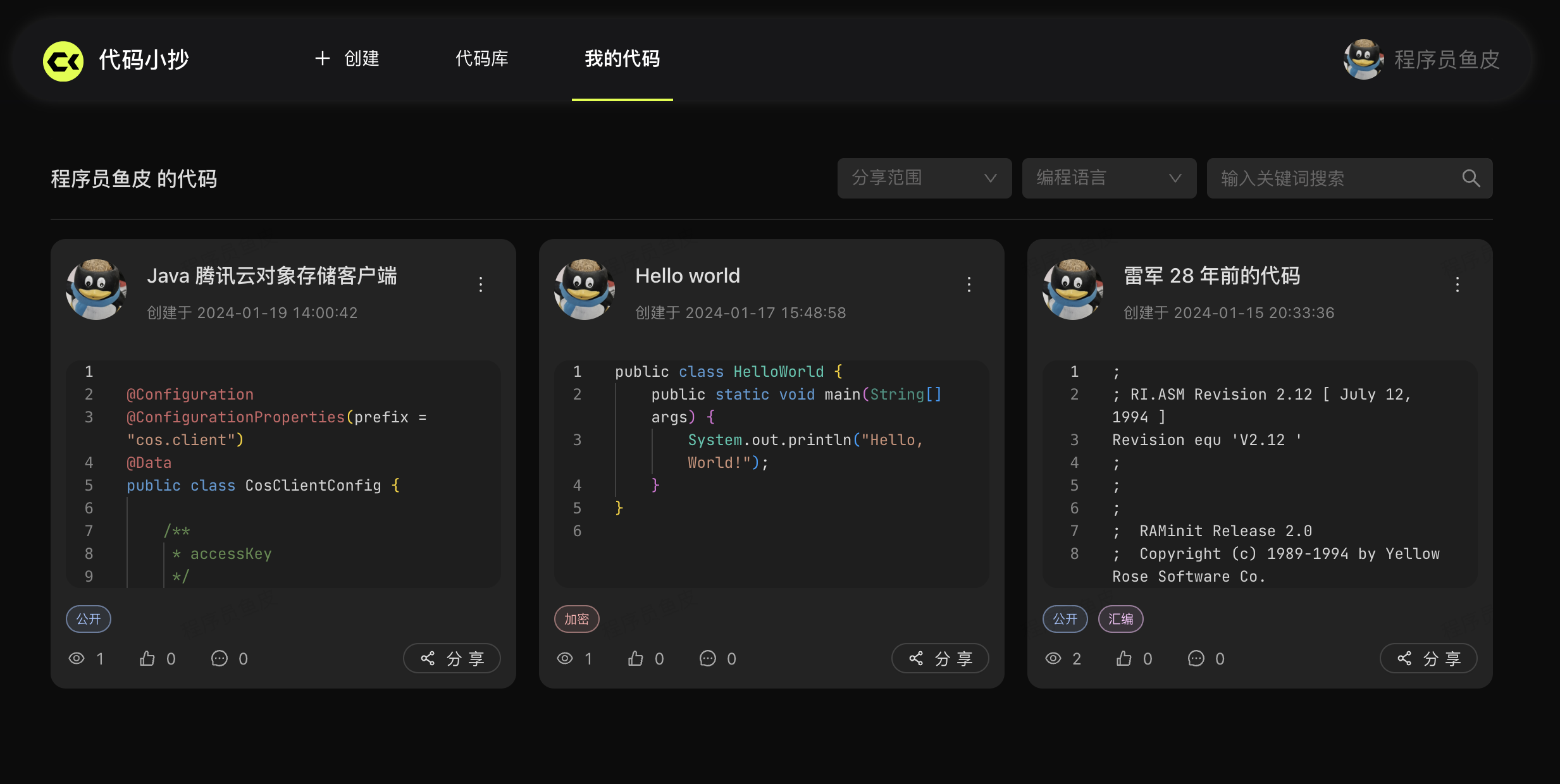代码小抄支持多种分享范围,比如公开、加密、仅个人可见等,不用担心自己的代码被泄露。