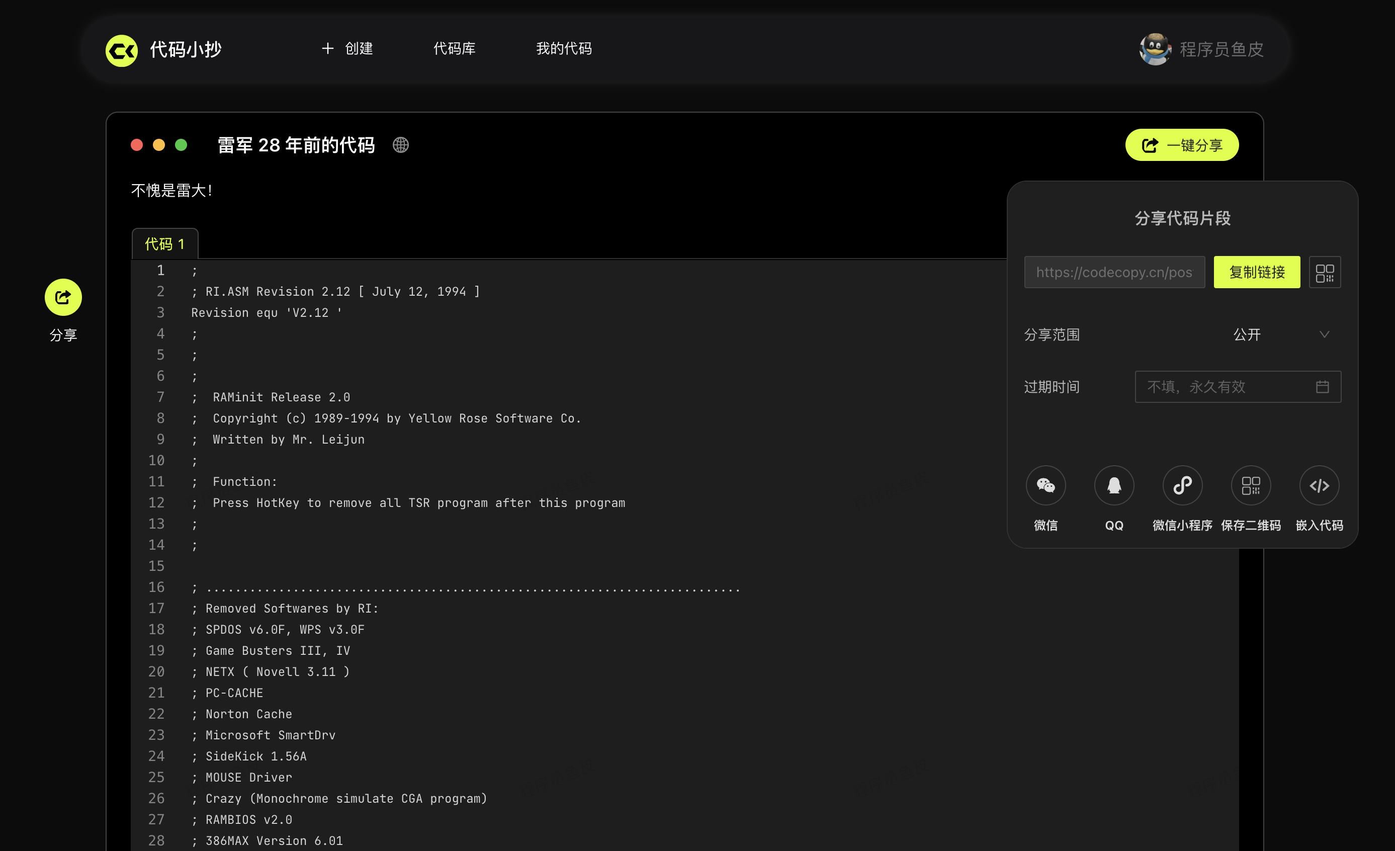比如我用代码小抄分享 雷军 28 年前的代码 :https://www.codecopy.cn/post/5265qv