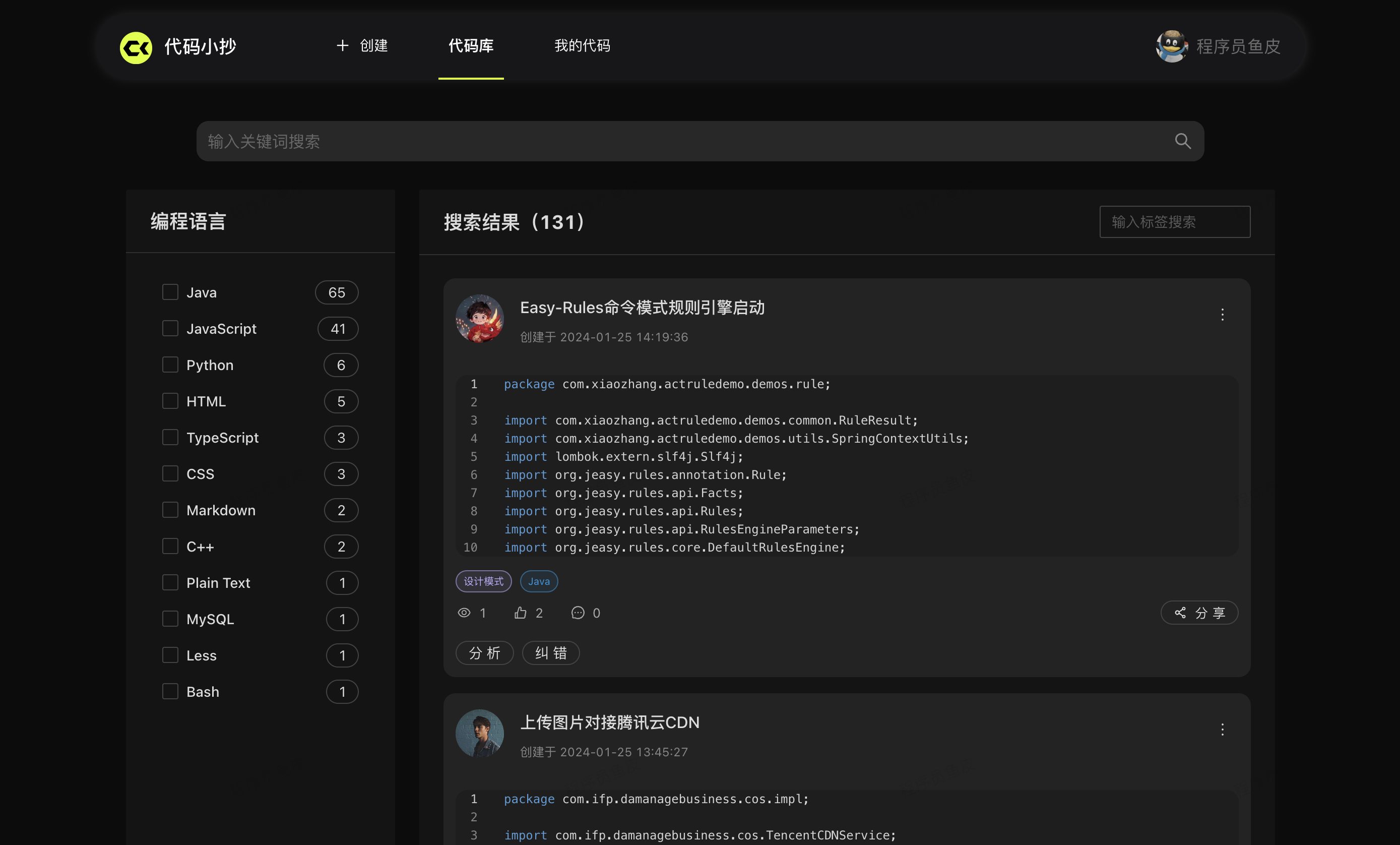 在代码库中,可以查看并学习其他同学分享的优质代码片段,支持按照标签、分类、关键词搜索: