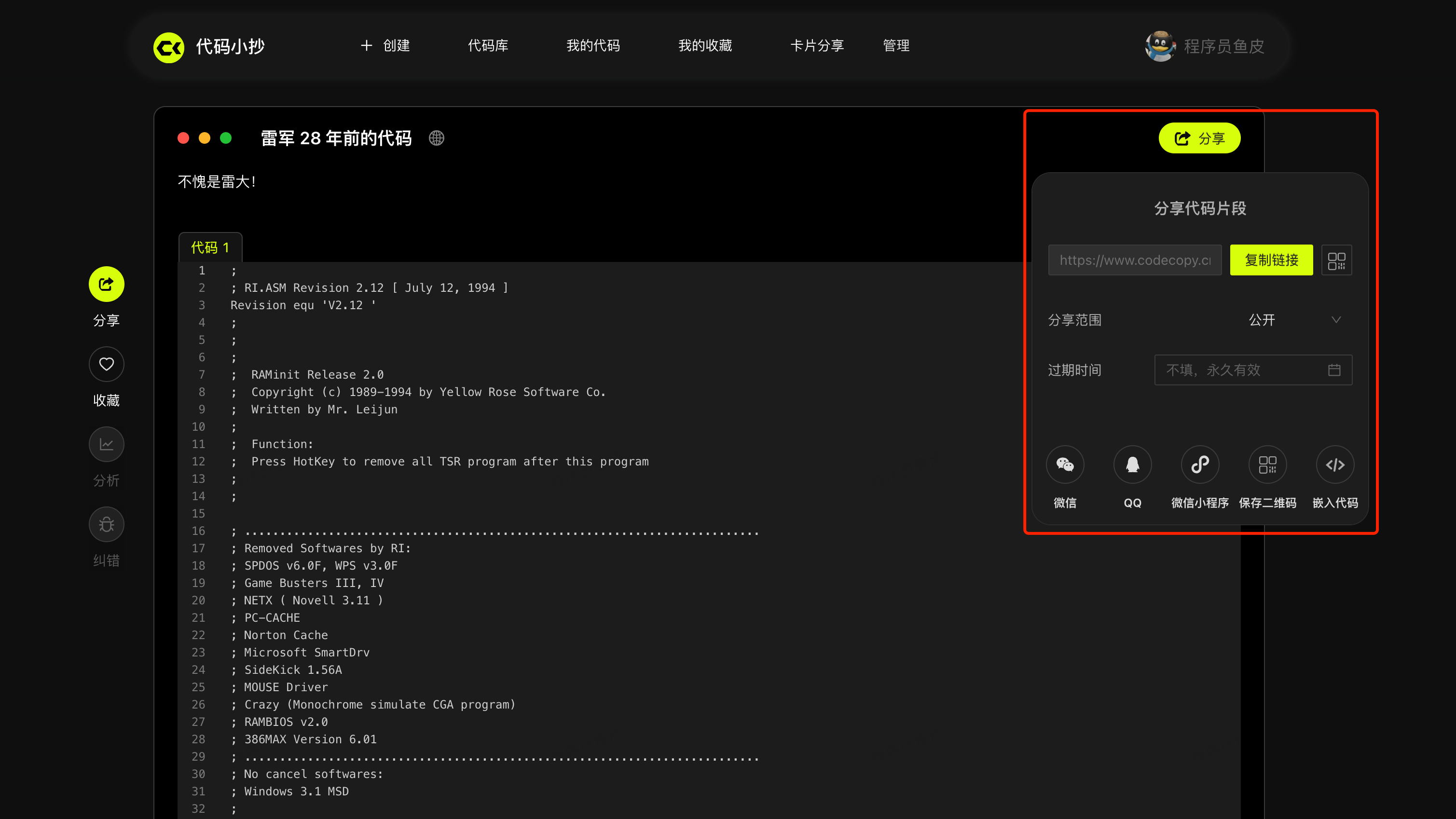 比如我用代码小抄分享 雷军 28 年前的代码 :https://www.codecopy.cn/post/5265qv