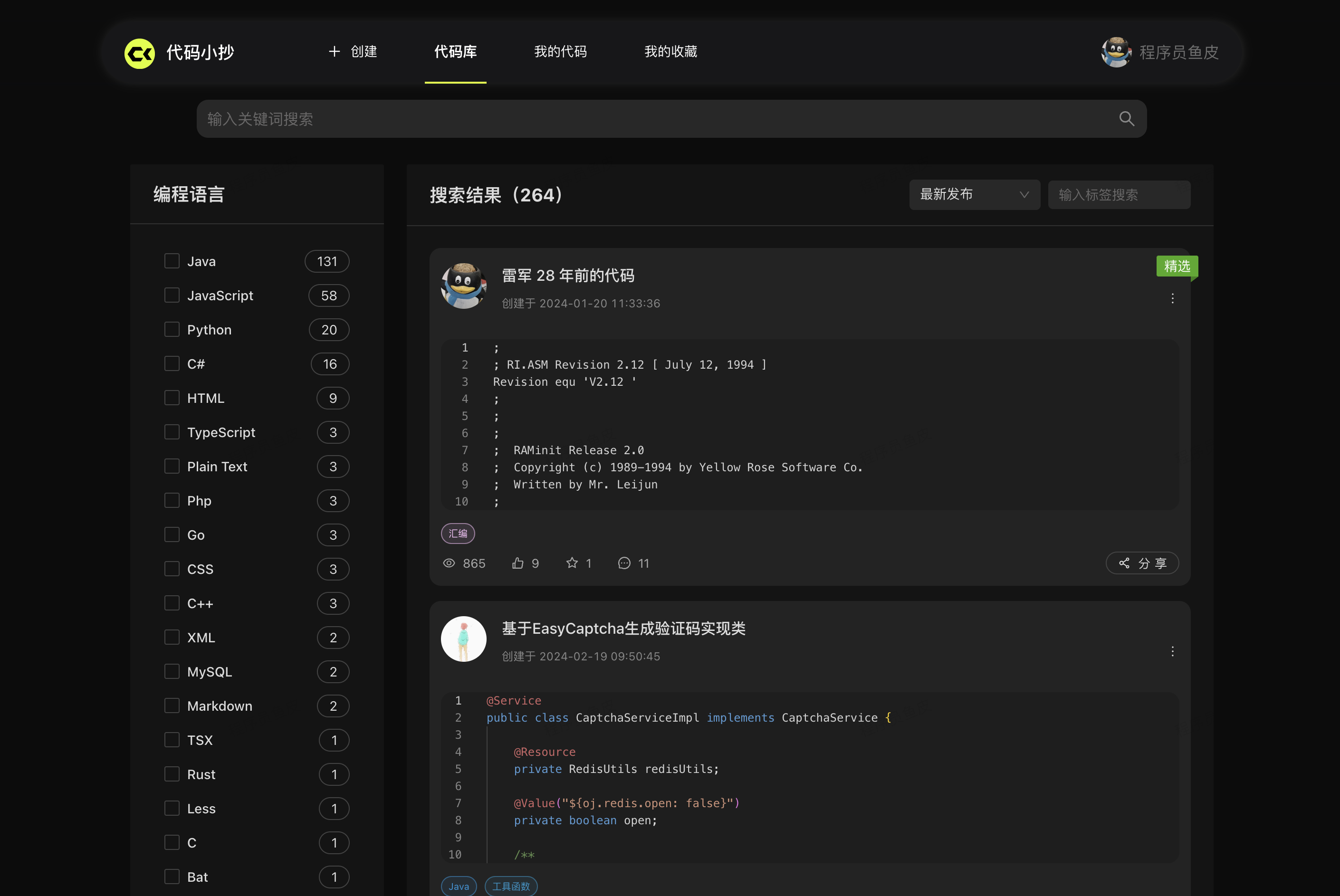 在代码库中,可以查看并学习其他同学分享的优质代码片段。支持按照标签、编程语言、关键词搜索,还支持多种排序方式,帮你快速发现优质代码: