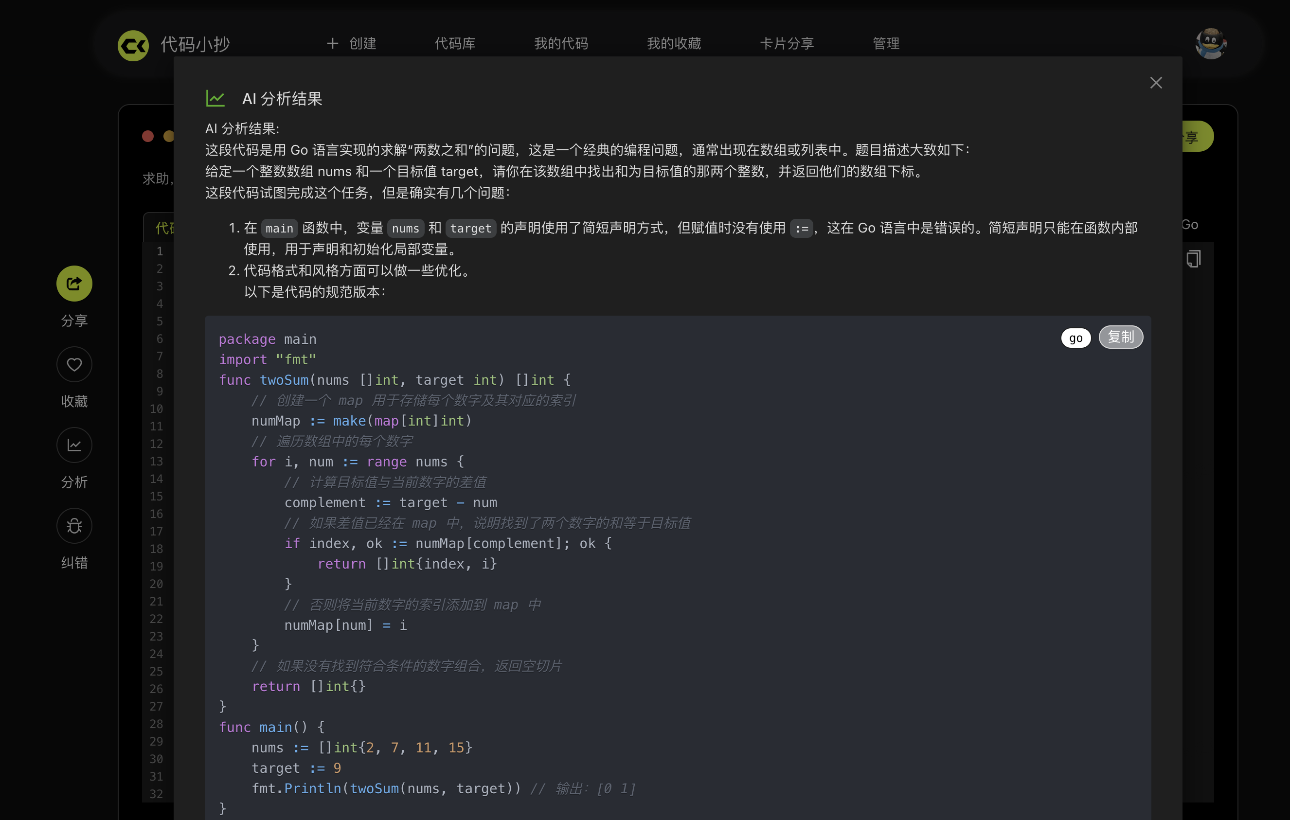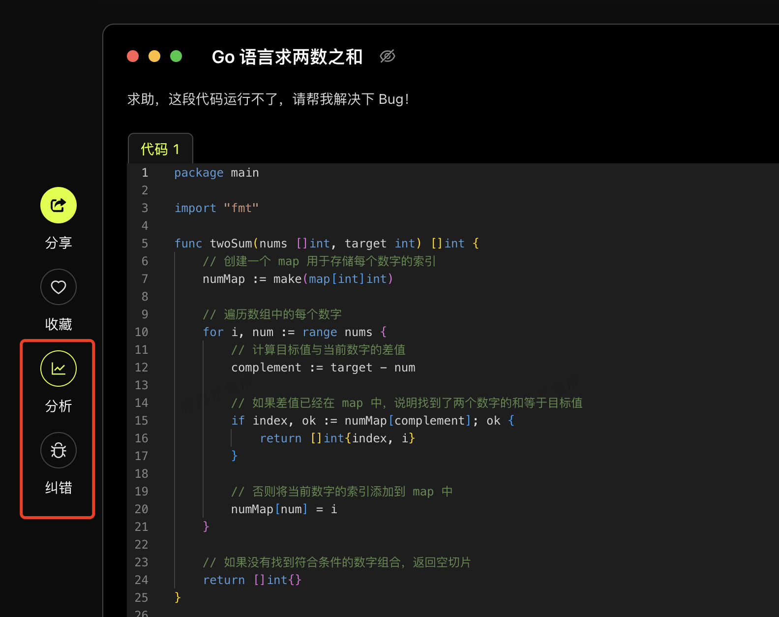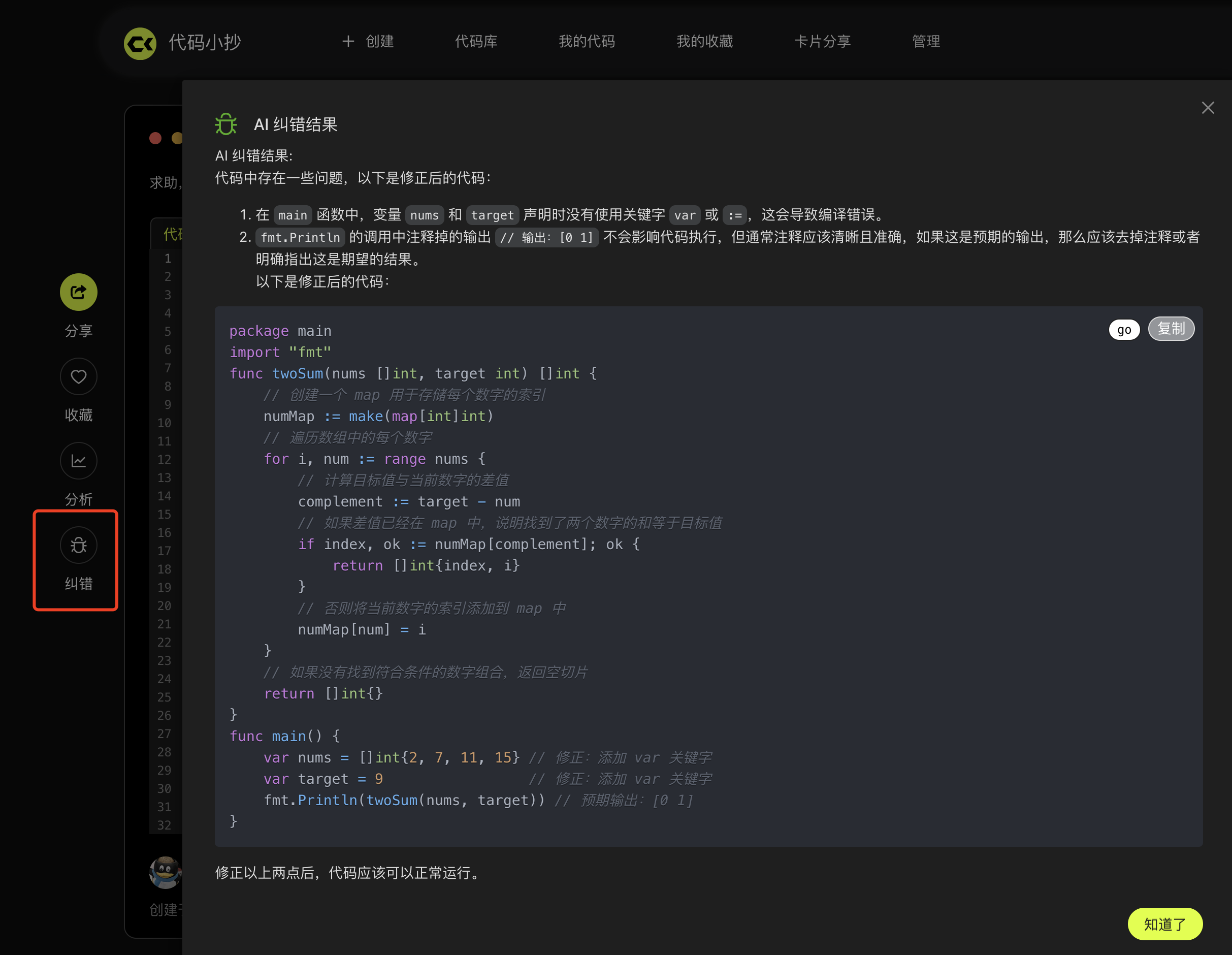 AI 智能代码纠错功能,可以帮你快速发现代码中的小 Bug: