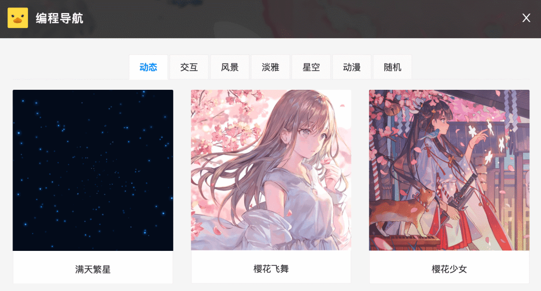 动态壁纸可不是指动态图片(GIF 等),而是使用 HTML5 Canvas 画布等技术实现的交互式网页。每一个动态壁纸都是一个独立小项目,包含 HTML、CSS、JS 等文件,可以直接在浏览器中运行。