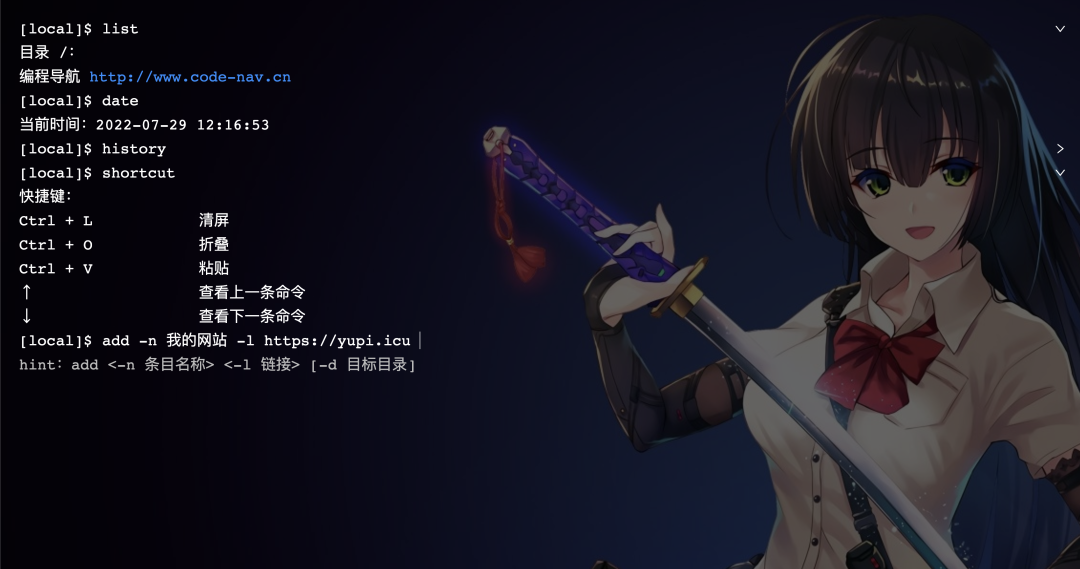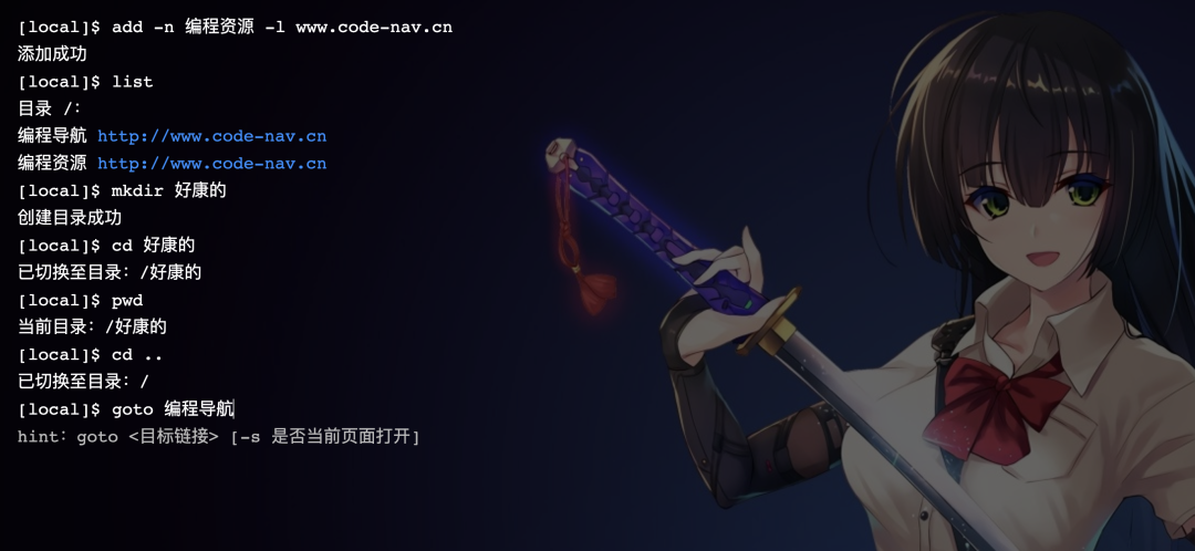 有点类似网页收藏夹,这里我参考了 Linux 的文件系统,可以用命令来管理你的常用网站。