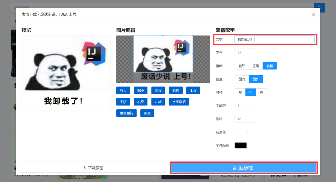 当你看上了一个表情图后,点击它,就能进入下载界面。在这里,你可以自由编辑表情图、给表情添加配字,制作新的表情包: