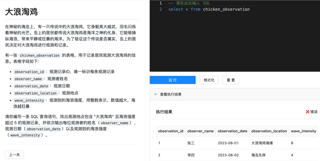 4)如果你写的 SQL 语句和预期的结果一致,那么就可以进入下一关啦