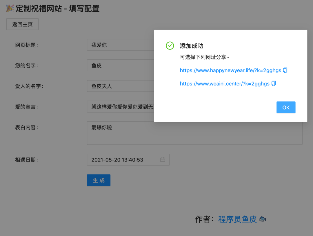 使用方式非常简单,直接选择你想生成的网站模板,然后输入自己的配置内容即可。最终会生成两个可在线访问的网址,每个网址都是鱼皮花了 “天价” 买来的,分别为 happynewyear.life(新年新生活)和 woaini.center(我爱你,以你为中心)。520 的话,当然要用后面那个域名啦,非常有寓意,据说能让你的表白心意翻倍!