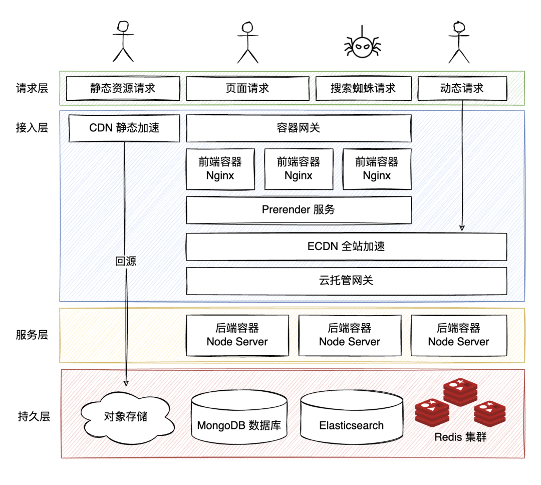 此外呢,为了让网站更好地被搜索引擎收录,我还搞了个 Prerender 服务。它的原理有点像 SSR(服务端渲染),如果识别到访问者是搜索引擎的小蜘蛛,Prerender 服务会将数据完整地拼接到页面后,再返回给它。