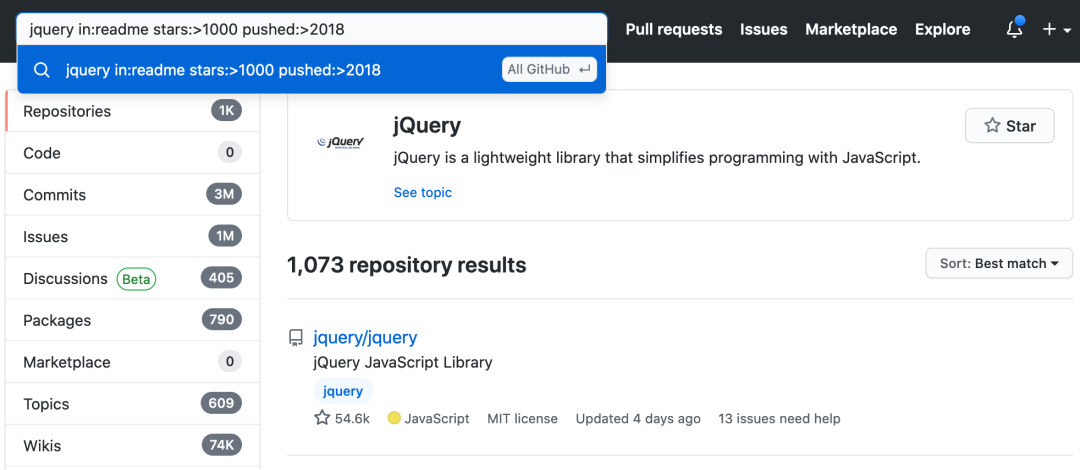 比如搜索自述文件中包含 jquery、star 超过 1000、且上次更新时间在几年内的仓库: