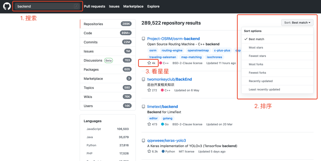 可以直接输入关键词搜索,再配合排序规则,能够较方便地找到优秀项目。