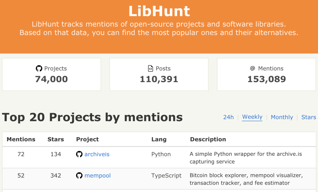 汇集了 GitHub 上实用的开源项目和软件类库,让编程人员快速发现好的项目。支持近 20 种不同编程语言的项目,以及各种热门标签,可以快速搜索,还能查看项目热度。