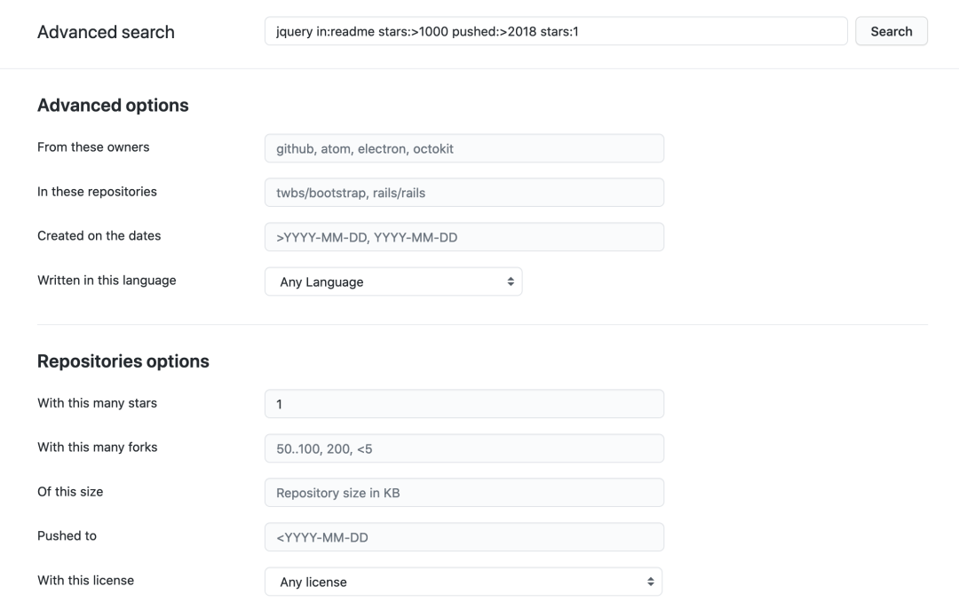 有很多过滤条件,但是 完全无需记忆!因为 GitHub 提供了 高级搜索,可以自动生成搜索表达式: