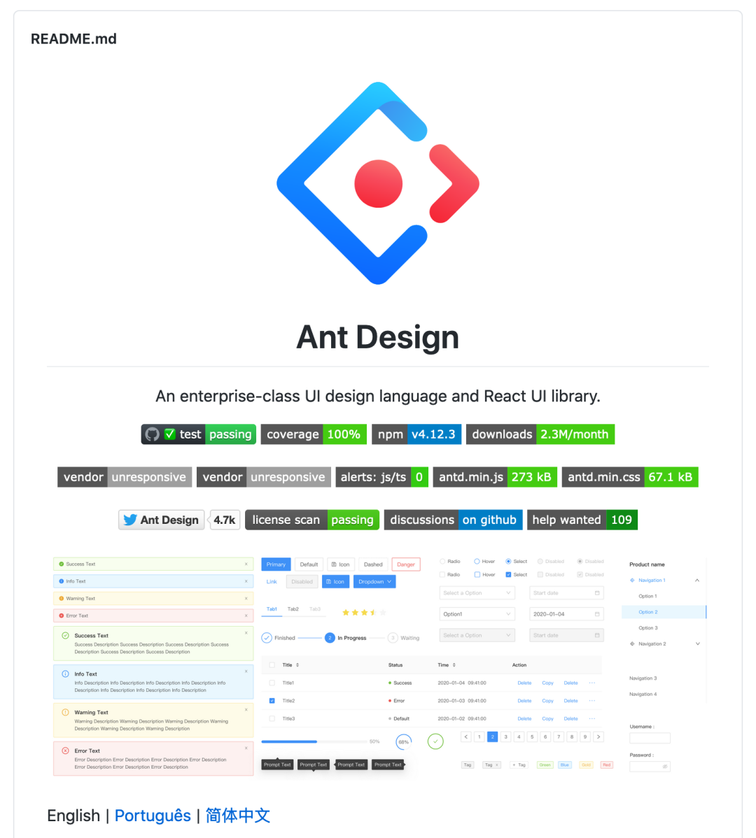 再往下看,一个好的项目的 README.md(项目描述)文件通常会更清晰和完善,比如 Ant Design 提供了多种语言的文档:
