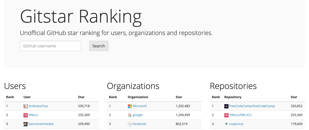 非官方的 GitHub 排行榜,按照 star 数进行排序,支持个人、组织和项目排行。能够发现成熟又活跃的优秀项目。