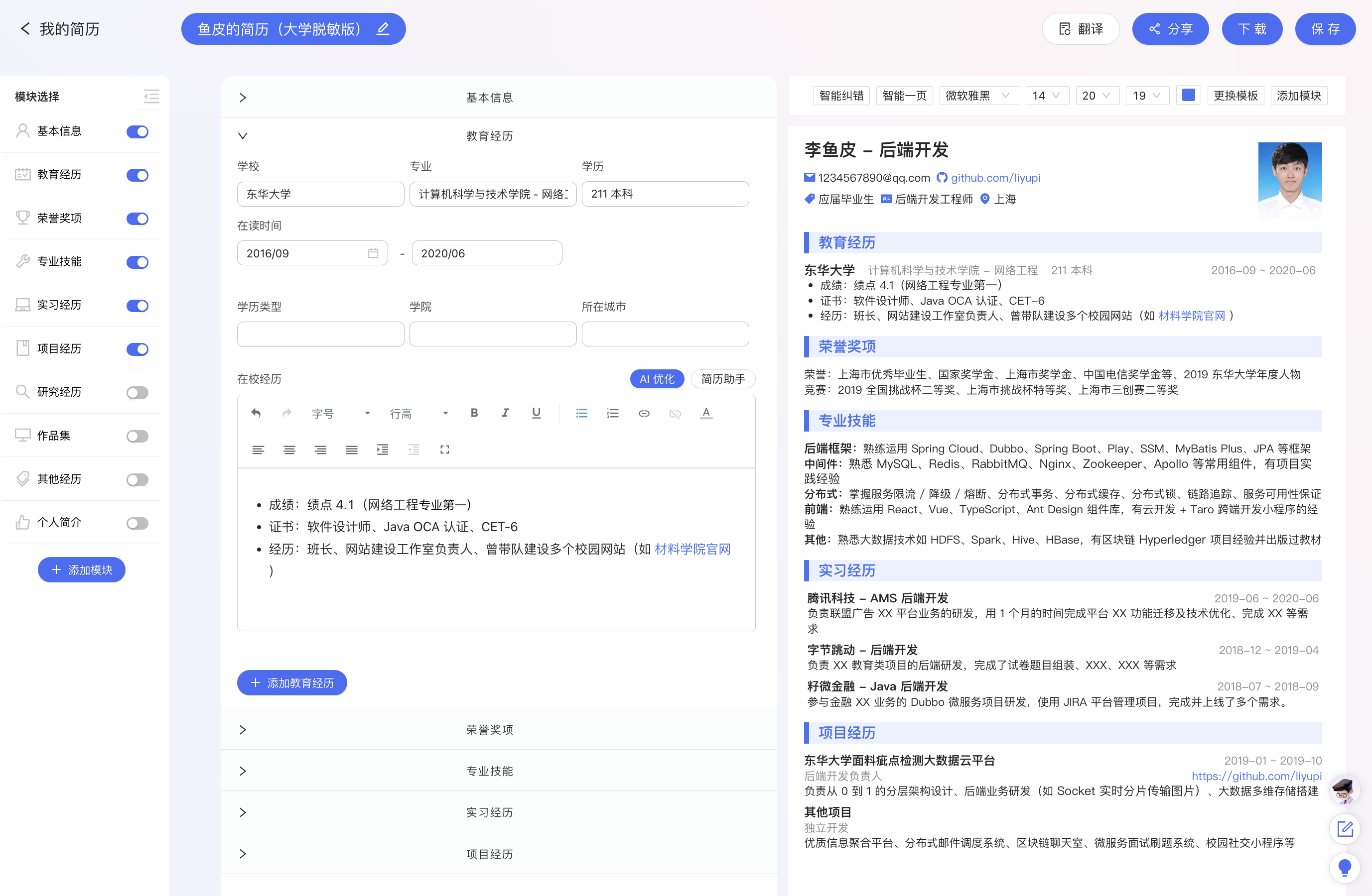 鱼皮的简历是使用了我们自己开发的 老鱼简历 制作,大家可以在线看:https://laoyujianli.com/share/yupi ,也可以用它快速做出自己的简历~