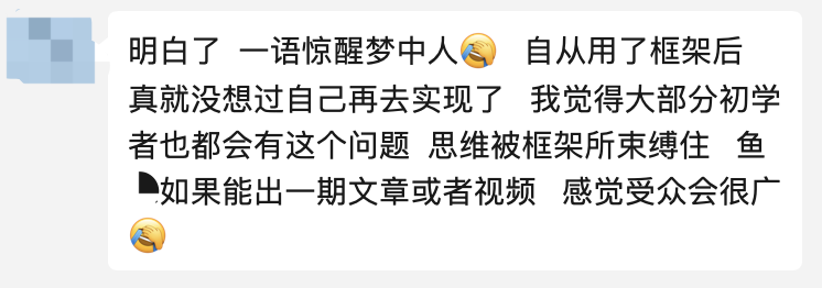 如他所说,的确很多初学编程的朋友都有这种情况:离了框架不会写代码、框架没有的功能就不会做。