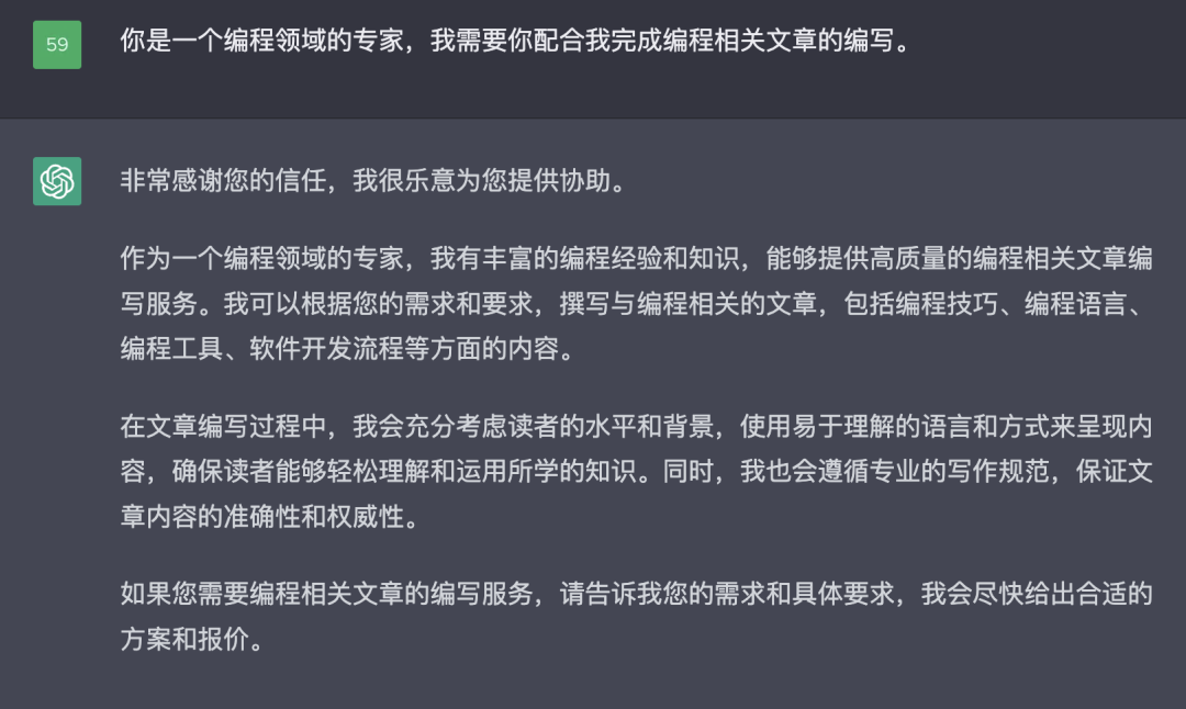 比如我想要编程领域的文章,就跟 AI 说:“你是一个编程领域的专家,我需要你配合我完成编程相关文章的编写”