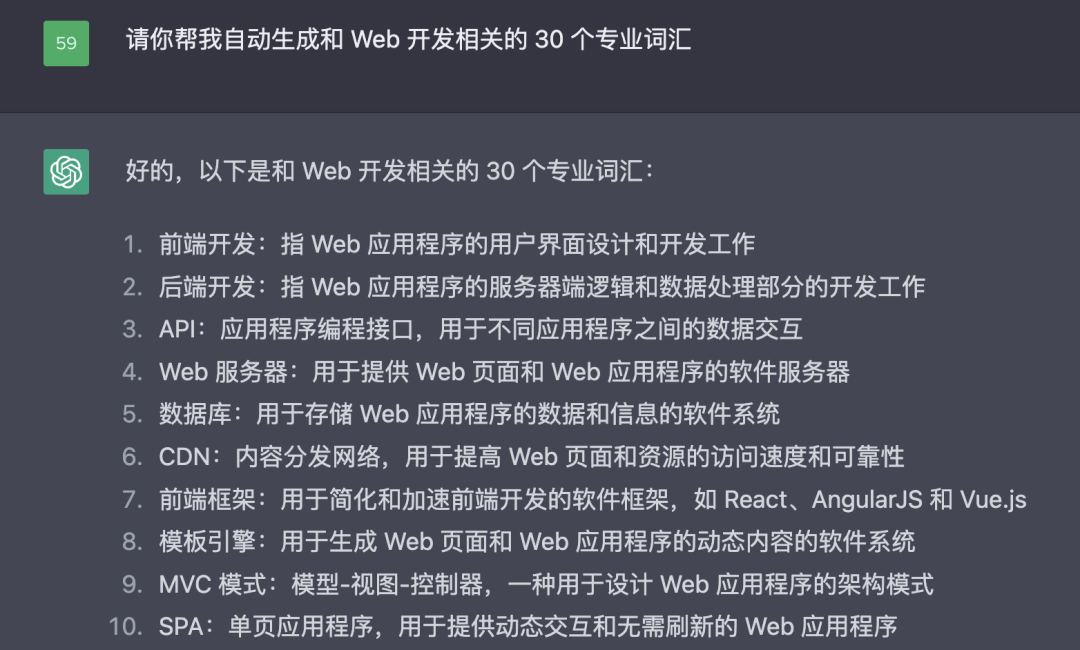 比如:“请你帮我自动生成和 Web 开发相关的 30 个专业词汇”