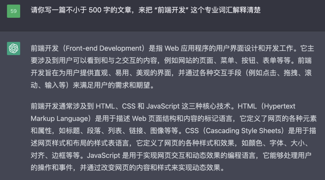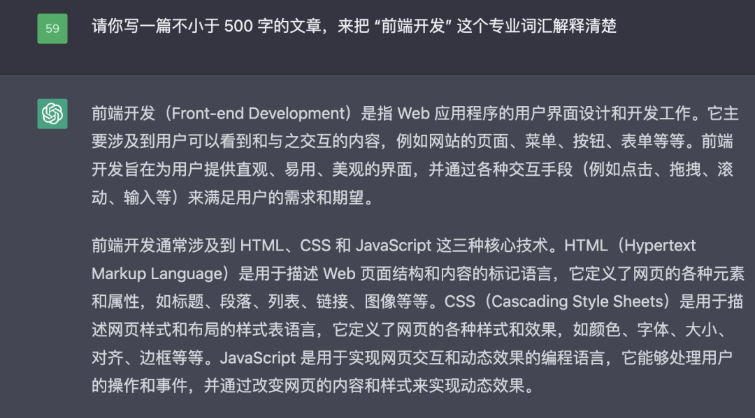 比如:“请你写一篇不小于 500 字的文章,来把 “前端开发” 这个专业词汇解释清楚”