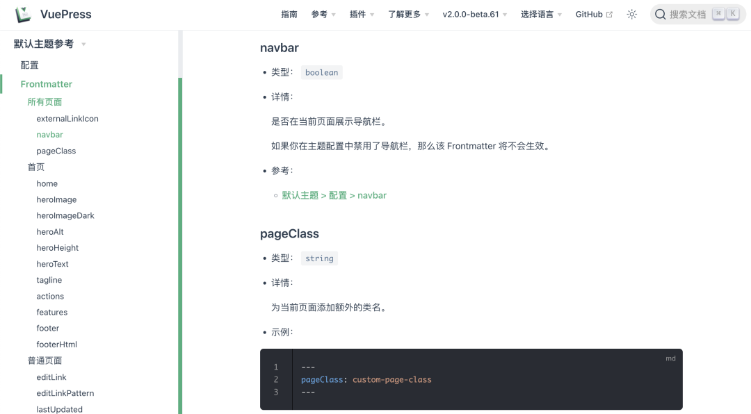 然后按照 Vuepress 文档中约定的规则,分别配置 navbar 顶部导航栏,以及 sidebar 侧边导航栏:
