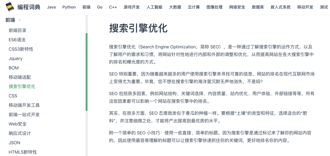 比如下面这个搜索引擎优化,这么大的 “坑” 用几段话就介绍完了: