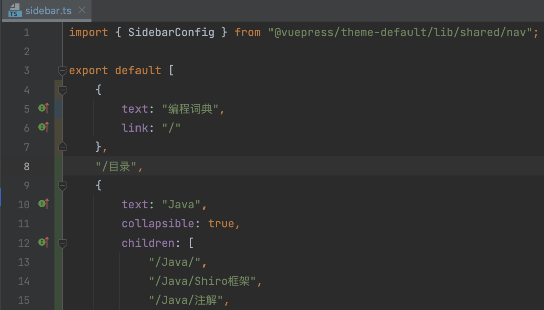 最后,利用之前得到的分类文件、词汇文件,你就可以通过程序自动化地生成 Vuepress 的导航栏配置文件,比如下面这段:
