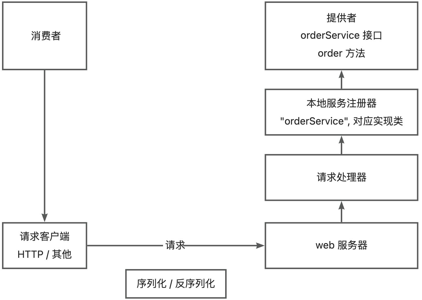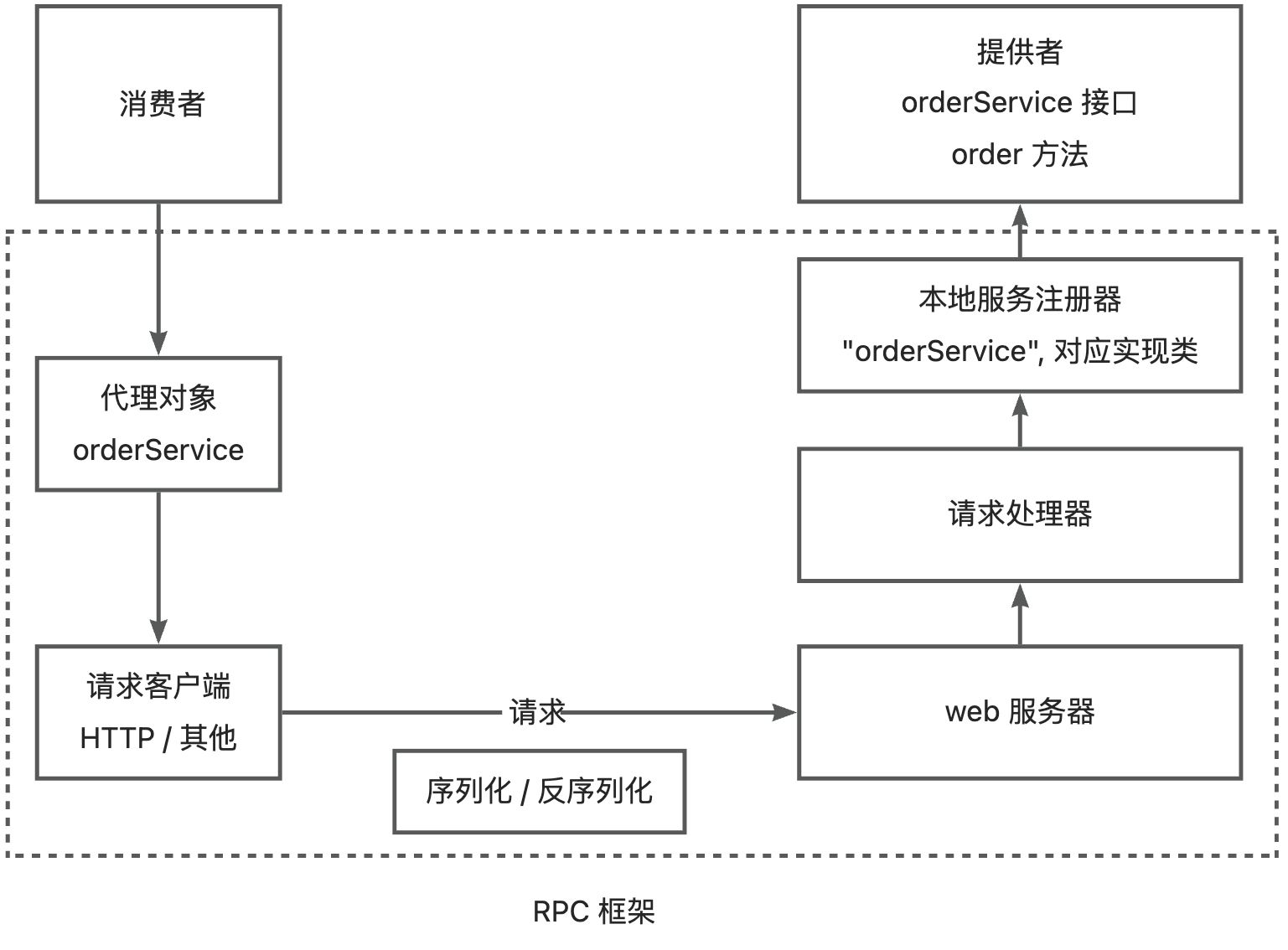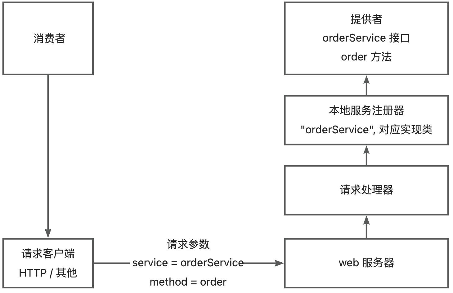 举个例子,消费者要调用 orderService 服务的 order 方法,可以发送请求,参数为 service=orderService,method=order,然后请求处理器会根据 service 从服务注册器中找到对应的服务实现类,并且通过 Java 的反射机制调用 method 指定的方法。