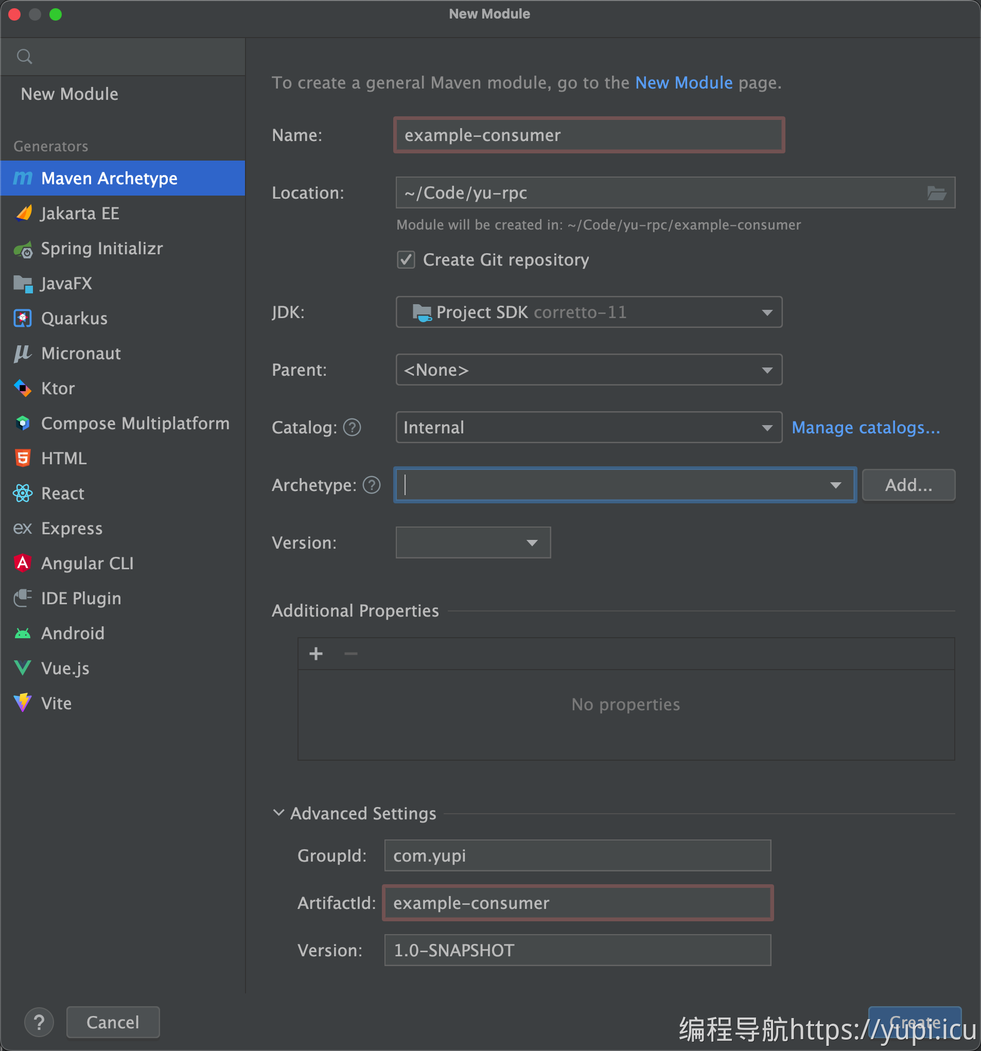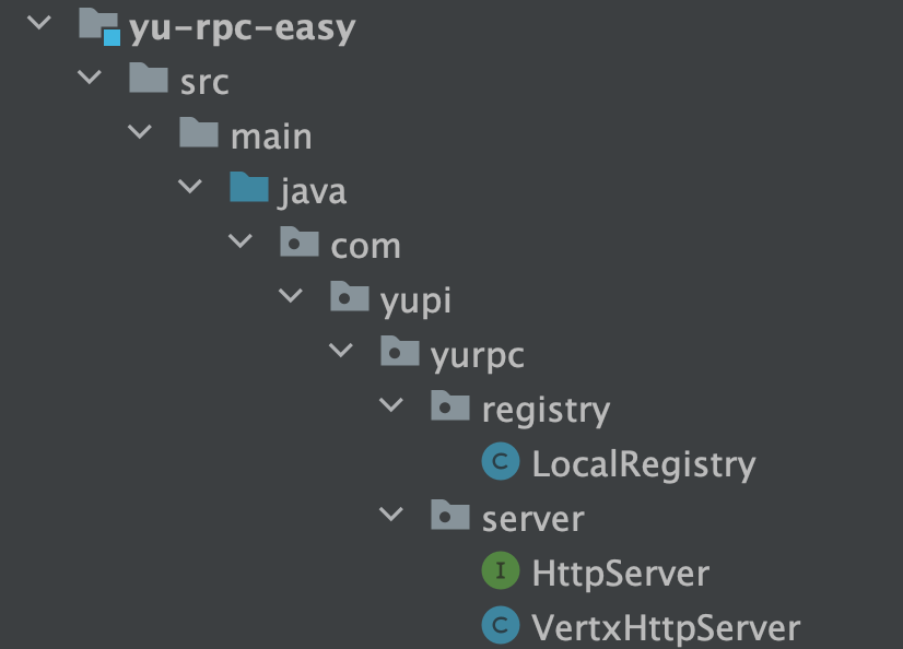 首先创建一个项目根目录 yu-rpc,然后使用 IDEA 开发工具依次创建几个 Maven 模块。