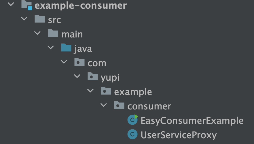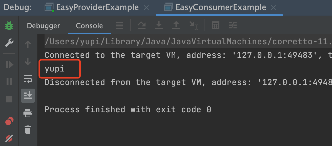 }然后修改 EasyConsumerExample,new 一个代理对象并赋值给 userService,就能完成调用: