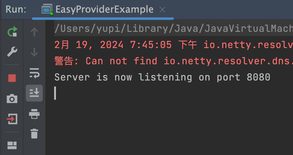 UserService userService = ServiceProxyFactory.getProxy(UserService.class);至此,简易版的 RPC 框架已经开发完成,下面我们进行测试。